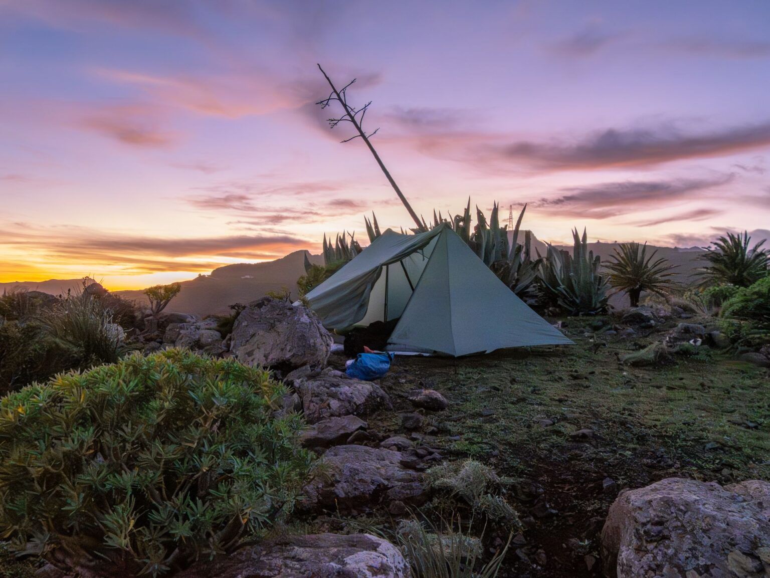 Der Abstieg auf der anderen Seite war wieder herrlich “urwaldmäßig”. Den restlichen Tag genoss ich fantastische Ausblicke auf Teneriffa und den Teide. Vorbei am markanten Vulkanschlot Roque de Agando wanderte ich weiter in die Abenddämmerung. An einem Rastplatz mit Grillstellen füllte ich meine Wasservorräte aus meinem Rucksack auf (Achtung: Das Wasser dort ist laut Schild kein Trinkwasser!). Mit vier Litern im Gepäck suchte ich mir schließlich einen versteckten Platz für mein Zelt.
